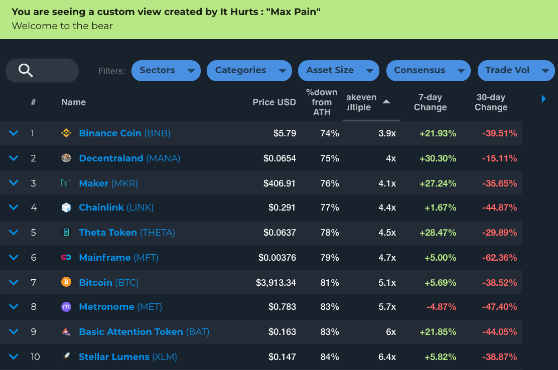 One of our favorite custom screens on OnChainFx has become the “max pain” dashboard created by Ryan Sean Adams. It tracks the basics of how far a token has fallen from its all time high, a “breakeven” multiple, and some basic price and return data. We check this out often, not just to alleviate our pain of bitcoin’s mere 80% downdraft (good relative performance!), but to wade through the wreckage for signs of life and projects that will come out the other side of the bear market.