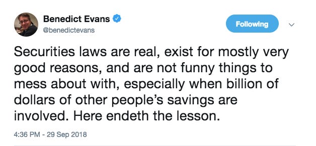[TBI Note: There are good people in the SEC. They are mostly well intentioned public servants, and they actually share our mission at Messari: protect investors, promote responsible capital formation, and keep the markets fair and efficient. The problem is that securities laws suck and are horribly outdated, the staff is overmatched, and the commission never actually penalizes the truly evil, just the truly easy to catch. Aside from the ineptitude of the SEC in adequately fulfilling its basic mission - at great national expense - it’s pretty great.]